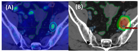 Research on the patterns of failure after MDT [13,54,55,56] has shown that most patients with an initial nodal disease experienced a lymphotropic pattern of recurrence, characterized by only a few metastatic lesions and a long interval of disease-free survival (DFS). These characteristics render them appropriate candidates for further rounds of SBRT, offering the potential to extend their DFS in the long run. Conversely, this model of spread also prompts the question of whether elective node radiotherapy (ENRT) in lymph node areas of known risk in conjunction with an extra boost to any PET-positive node, could diminish the likelihood of subsequent pelvic relapses and enhance clinical outcomes compared to SBRT alone (Figure 1).