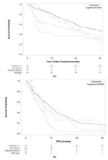 We assess OS and TNT in different lines according to molecular subtypes. Our data corroborate existing evidence on the major impact of mutational status on tumor evolution and response to available TKI [22,23,24,25]. Patients with the wild type of GIST had the worst prognosis, with an OS of only 59.2 months and TNT in the first, second and third lines of 19.1 months, 6.4 months and 4.9 months, respectively, despite important use of LR procedures. On the other hand, patients with a metastatic GIST bearing a PDGFRa D842V mutation had the best survival, with a median OS not reached at the time of data cutoff, but a disease refractory to existing TKI, illustrated by TNT in the first, second and third lines of 5.4 months, 9.4 months and 5.8 months, respectively. As awaited, patients with KIT exon 11 mutation had the best outcome, with a median OS of nearly eight years in the metastatic setting and TNT in the first and second lines of almost three and one year, respectively.
