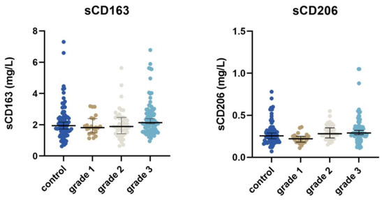 Patients with low-grade tumours had lower sCD163, sCD206, and sSIRPα compared to patients with high-grade tumours (sCD163: 1.83 mg/L vs. 2.13 mg/L, p = 0.08; sCD206: 0.22 mg/L vs. 0.29 mg/L, p < 0.001; and sSIRPα: 24.85 µg/L vs. 28.6 µg/L, p = 0.01; see Supplementary Table S1). There was no correlation between tumour grade and sLILRB1 (Figure 5).