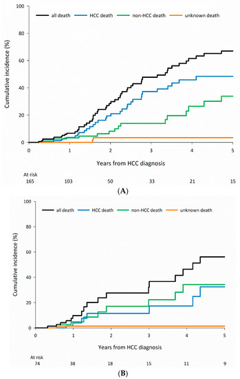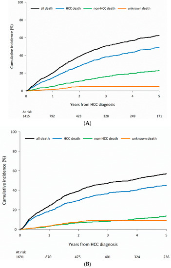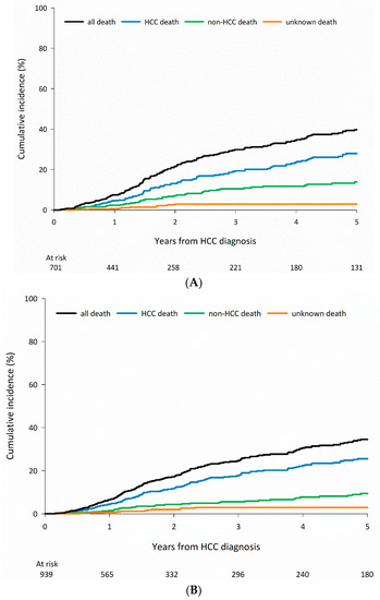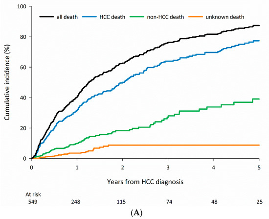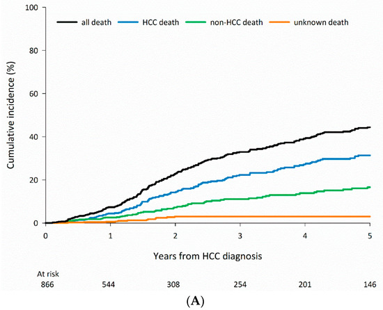 Although most patients die of HCC-related causes, non-HCC-related death represents a competing event among patients who engage in alcohol use and receive curative treatment and among patients 75 years and older in the HBV and all-negative groups who receive curative treatments. The results of the current study underscore the importance of assessing and managing underlying comorbidities, especially among certain subgroups of patients with HCC.