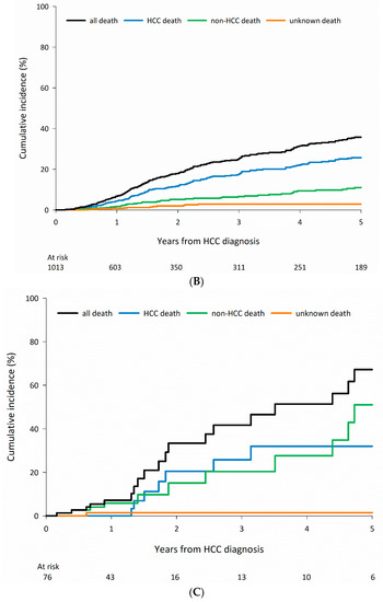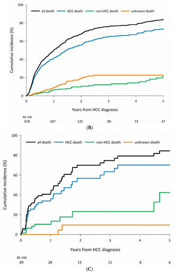3.3. Cause-Specific Mortality among Patients Who Received Curative Treatments According to CLD Etiology