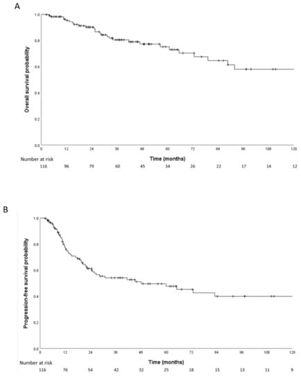 A smaller greatest tumor dimension and upfront surgery were independently associated with improved OS. Surgical status and upfront surgery were independently associated with PFS. Complete surgical resection has been reported to be an important prognostic factor [25]. The rate of complete resection varies from 20% to 88% in published series [26,27,28,29,30,31]. In the present study, 56.0% of cases underwent an R0 resection and the rate of complete resection decreased with increasing stage. Patients who underwent an R0 resection had a higher 5-year (68.8% vs. 33.9%, p = 0.021) PFS compared to patients with an R1/2 resection. Therefore, complete resection seems to lead to long-term recurrence-free survival even in locally advanced thymic carcinomas. Thus, the goal of any surgical approach should be an R0 resection. In multivariate analysis, chemotherapy was not associated with OS or PFS, which differs from previous reports where chemotherapy seemed to have benefit in both surgical and nonsurgical settings [32,33].