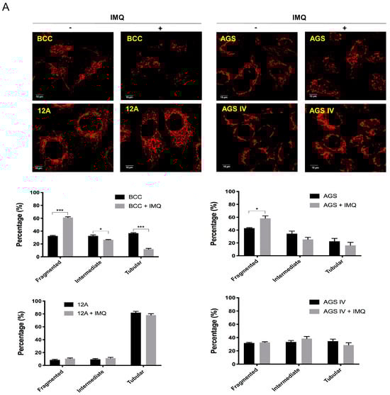 Cancer cells were seeded in 6-well plates containing coverslips (2 × 105 cells/well) and allowed to reach 70–80% confluency. After treatment with 50 µg/mL IMQ in 1 mL of medium, the cells were cultured for 24 h. To assess mitochondrial morphology, the cells were stained with 100 nM MitoTracker Red CMXRos or 100 nM MitoTracker Green FM for 30 min. Fluorescence images were acquired via a confocal microscope (Olympus, FV1000D). Mitochondria were categorized on the basis of their morphology via CellSens Software (Olympus). The mitochondria that were wholly fragmented or permeabilized were classified as fragmented mitochondria (Class 1), those with clear networks were labeled as tubular mitochondria (Class 3), and those with other shapes were categorized as intermediate mitochondria (Class 2). The proportions of mitochondria with these specific morphologies were calculated as percentages of the total number of examined cells (100 cells per experiment).