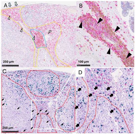 Then, we focused on the identification of TLSs and their clinical significance within GIBMs. TLSs are structures typically located within the tumor stroma and peritumoral areas of the primary solid cancers []. Therefore, we first visually distinguished the tumor epithelium, composed of the malignant cells, and the tumor stroma, composed of the blood vessels or infiltrating immune cells, in the GIBM tissues. Prior to analyzing TIL subsets, we performed CD3 immunostaining to visualize the overall T cell distribution. The distribution of CD3+ T cells in serial tissue sections (Figure S1A) corresponded to the combined distribution patterns of CD4+ and CD8+ cells (Figure S1B,C, respectively). We then focused on analyzing the distribution of CD20+ TIBs and CD4+ T cells, recognized as the primary components of TLSs []. TIBs (Figure 1A, brown) were predominantly found around the blood vessels (white arrowhead) within the tumor stroma (yellow dotted line). Conversely, CD4+ T cells (Figure 1A, red) were more widely distributed, extending from the meninges (white arrows) to the tumor stroma (yellow dotted line), yet similarly clustered in the regions where TIBs were clustered (blue dotted line). To determine whether these lymphocyte clusters would share the characteristics of TLSs previously reported, we evaluated the expression of BCL6, an indicator of germinal centers (GCs) []. Although BCL6+ cells were sporadically observed, typical GC-like clusters of BCL6+ TIBs were absent (Figure 1B, black arrowheads). We also examined the expressions of CD21 and PNAd, indicators for follicular dendritic cells (FDCs) and high endothelial venules (HEVs), respectively, key components of TLSs []. Nevertheless, similar to BCL6 expression, the lymphocyte clusters in BMs lacked CD21+ and PNAd+ cells (Figure S1).