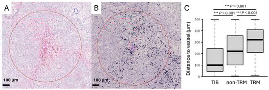 To further evaluate the spatial characteristics of TIBs and TRMs within the GIBM tissues, we analyzed their proximity to tumor-associated blood vessels. This analysis focused on four cases (Cases 2, 3, 9, and 11) noted for their significant presence of both cell types in the perivascular regions of the tumor stroma (Figure 2A,B, red circle). The distance between these immune cells and nearby blood vessels was independently measured and analyzed. TIBs were located significantly closer to blood vessels than non-TRMs (p < 0.001; Figure 2C), and the non-TRMs were located significantly closer to blood vessels than TRMs (p < 0.001). These data suggest a preferential distribution of TIBs within tumor stroma, while TRMs would exhibit the ability to penetrate deeper into the TIME and potentially maintain their presence longer than both TIBs or non-TRMs.