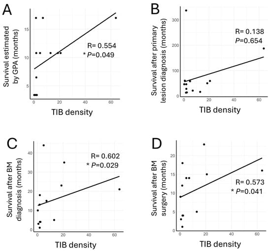 TIB density in BM tissues correlates with OS including GPA. Spearman’s rank correlation coefficient analyses between TIB density and OS after (A) the estimated survival by the Graded Prognostic Assessment (GPA), (B) primary lesion diagnosis, (C) BM diagnosis, and (D) BM surgery. *, p < 0.05.