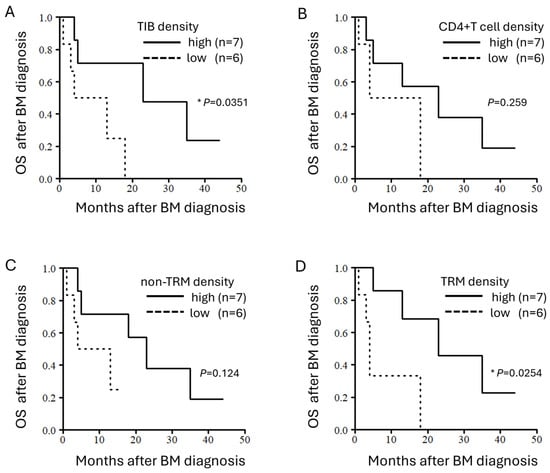 Densities of TIBs and TRMs correlate with OS after BM diagnosis. Kaplan–Meier curves for OS after BM diagnosis stratified by the density (high vs. low) of (A) TIBs, (B) CD4+ T cells, (C) non-TRMs, and (D) TRMs. The patients were dichotomized into high and low groups based on the median value of each TIL subset density. *, p < 0.05.