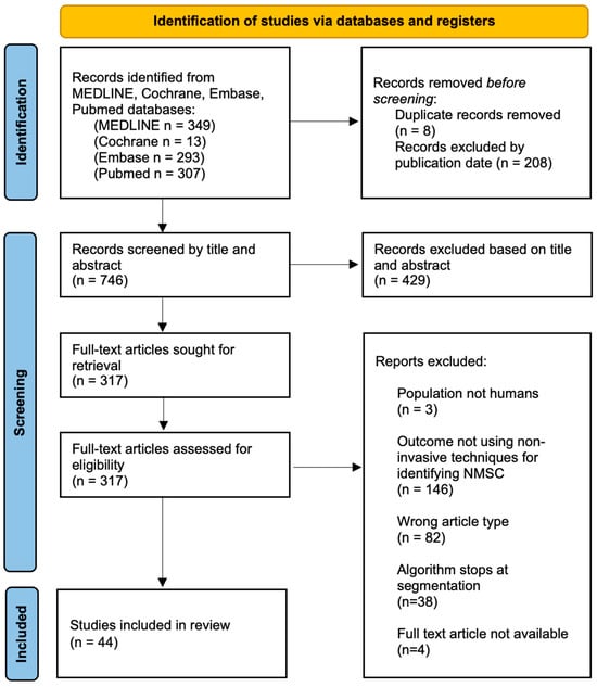 Articles published from January 2018–December 2023 were identified from comprehensive searches of MEDLINE, Cochrane, and Embase. Search terms included “skin neoplasms”, “diagnostic techniques and procedures”, “artificial intelligence”, “algorithms”, “computer systems”, “lesion or growth or cancer or neoplasm or tumor or malignant or metastatic”, “carcinoma”, “machine or deep learning”, “neural network”, “diagnosis or detection”, “nonmelanoma”, “basal-cell carcinoma”, “squamous-cell carcinoma”, “dermoscopy”, “reflectance confocal microscopy”, and “optical coherence tomography”. Records were screened from MEDLINE, Cochrane, Embase, and Pubmed databases, yielding a total of 967 articles. Prior to initial screening, duplicate articles and articles published prior to 2018 were excluded.