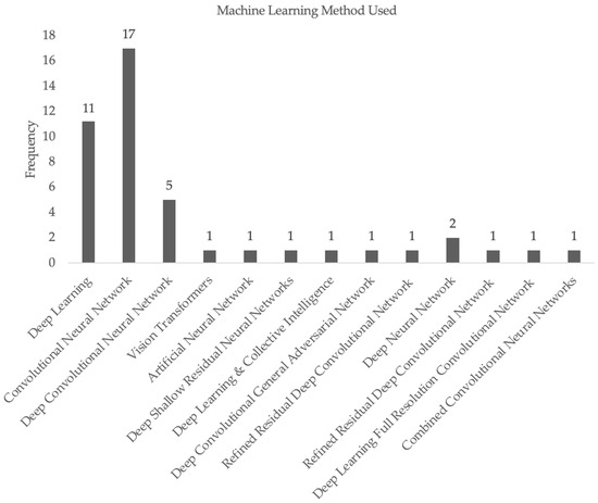 Lastly, Figure 3 displays the variety of machine learning methods utilized across the studies included in our systematic review. The majority of the studies used CNN as the method for the generation of their machine learning algorithms, with deep learning as the second most common method. DCNNs and DNNs were utilized by a small number of studies, and each of the other papers applied novel, independently generated methods in their algorithms.