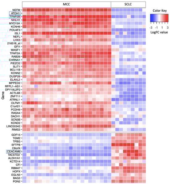 Heat map of highly differentially expressed protein-coding genes in MCC and SCLC tumors. Differentially expressed genes (n = 48) have an absolute log2 fold change (LogFC) greater than 3 and an adjusted p-value less than 1 × 10−10. Candidate genes (annotated in boxes) ATOH1 and TFAP2B were selected as IHC markers for MCC and CEACAM6 was selected for SCLC. MCC, Merkel cell carcinoma. SCLC, small cell lung cancer.