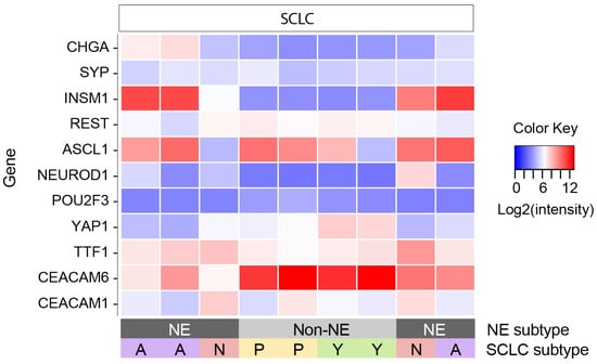 SCLC tumors have distinct molecular subtypes []. Some SCLC tumors have higher expression of neuroendocrine (NE) marker genes such as CHGA, SYP, and INSM1, whereas non-NE tumors express higher levels of REST []. The NE tumors can be further divided into SCLC-A and SCLC-N subtypes based on the expression of the transcription factors ASCL1 and NEUROD1, respectively. The non-NE tumors can be subtyped into SCLC-P and SCLC-Y based on the relative expression of POU2F3 and YAP1. Although the subtyping of SCLC tumors using microarray expression data has not been validated, we were able to subtype the SCLC samples used for the differential gene expression analysis (Figure 2). Notably, our cohort included tumors of all four SCLC subtypes. Although the non-NE tumors appeared to have the highest levels of the candidate marker gene, CEACAM6 was expressed by tumors of all SCLC subtypes.