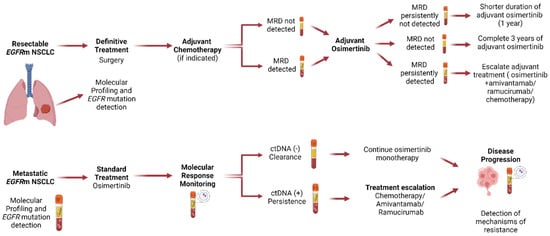 Apart from its established role in comprehensive genomic profiling for advanced NSCLC, ctDNA enables the identification of resistance mechanisms at the time of disease progression []. It can also serve as a supplementary disease monitoring strategy by helping with risk stratification during treatment [,].