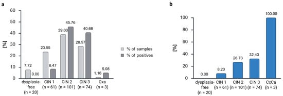 Due to the variation in sample numbers, the percentages of positive and negative samples were calculated (Figure 1a). The actual numbers of samples are included in Table 1, which shows the descriptive statistics. In order to avert the fabrication of results, the samples from the dysplasia-free follow-up checks (n = 30) were excluded from the analysis. With that, 259 samples were analyzed. The diagnosis of CIN 3 necessitates the surgical excision via the conization of the dysplasia. Consequently, carcinomas are sporadic in our dysplasia unit, and we were only able to include three samples (1.16%) in our study. Dysplasia-free samples constituted 7.72% of the total, with the majority (16 of 20) belonging to the category of regressive dysplasia. The majority of patients exhibited dysplasia of higher grades. Therefore, 61 samples with CIN 1 (23.55%), 101 samples with CIN 2 (39.00%), and 74 samples with CIN 3 (28.57%) were included (Figure 1a, Table 1).