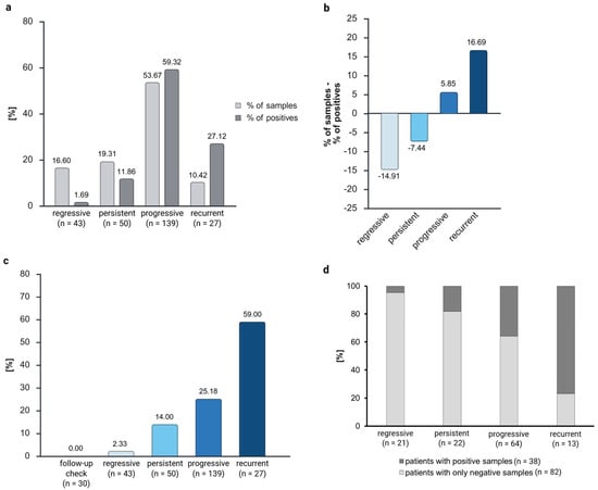 Therefore, regressive samples exhibited 14.91% less positivity than their sample number, persistent samples demonstrated 7.44% less positivity than the sample amount, progressive samples exhibited 5.65% higher positivity than the sample amount, and recurrent samples exhibited 16.69% more positivity than the sample amount (Figure 2b).