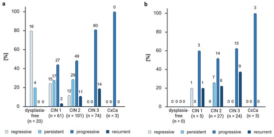 The combination of biological groups (Table S2) and grades exhibited a higher proportion of aggressive (progressive and recurrent) samples with a higher CIN grade (progressive: 0% of dysplasia-free patients, 44.26% of CIN 1, 48.51% of CIN 2, 81.08% of CIN 3, and 100% of carcinoma; recurrent: 0% of dysplasia-free patients, 3.28% of CIN 1, 10.89% of CIN 2, 18.92% of CIN 3, and 0% of carcinoma) (Figure 3a). Furthermore, a lower number of regressive samples (80% of dysplasia-free patients, 24.59% of CIN 1, 11.88% of CIN 2, 0% of CIN 3, and 0% of carcinoma) and persistent samples (20% of dysplasia-free patients, 27.87% of CIN 1, 28.71% of CIN 2, 0% of CIN 3, and 0% of carcinoma) with a higher CIN grade (Figure 3a) could be observed. However, given the standard procedure of the conization of CIN 3 cases, it is not possible to observe the regression or persistence of a CIN 3.