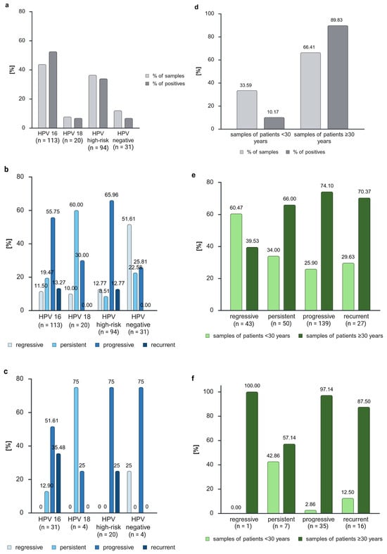 The samples included in this study were either infected with HPV 16 (43.75%), HPV 18 (6.94%), other high-risk HPV types (38.54%), or were uninfected (10.76%) (Figure 4a, Table 1). A higher proportion of ZNF671 methylation-positive samples was observed in HPV 16-infected samples (52.54%) compared with the total sample size (43.80%). For high-risk HPV and negative samples, the reverse outcome was observed, exhibiting a lower number of positives compared with the sample volume. The distribution of these results into the various biological groups (Figure 4b, Table S2) demonstrated that the majority of HPV 18-positive samples were persistent samples (n = 12, 60%), and three of these were methylation-positive (Figure 4c). The majority of HPV 16-positive samples exhibited progressive characteristics (n = 63, 55.75% of the samples, 51.61% of the positives). However, a notable increase in positivity was observed among recurrent samples (13.27% of the samples, 35.48% of the positives). The majority of the samples exhibiting regression were HPV-negative, accounting for 51.61% of the total. For samples infected with other high-risk strains, progressive and recurrent samples exhibited a comparable increase in positivity, proportionate to their sample size (progressive: 65.96% of samples, 75% of positives; recurrent: 12.77% of samples, 25% of positives). Notably, the sole ZNF671 methylation-positive regressive sample was HPV-negative. The remaining GynTect®-positive and HPV-negative samples exhibited a progressive pathology (n = 3).