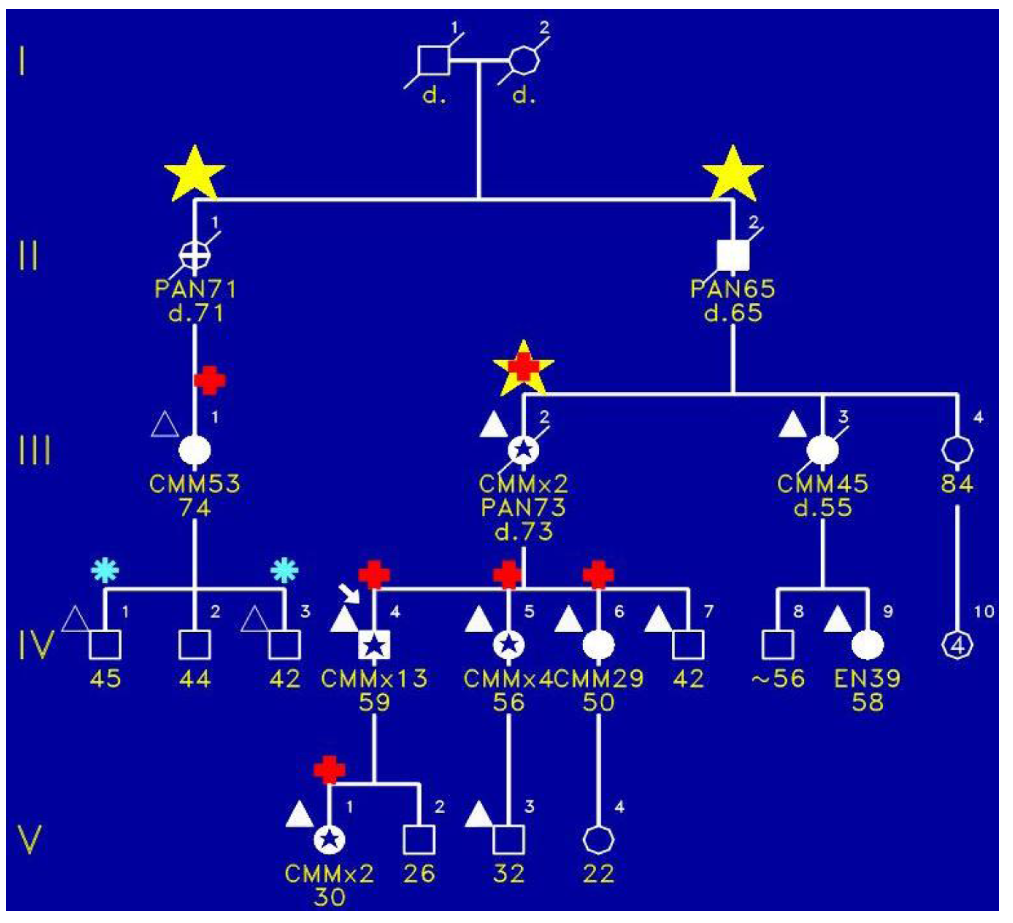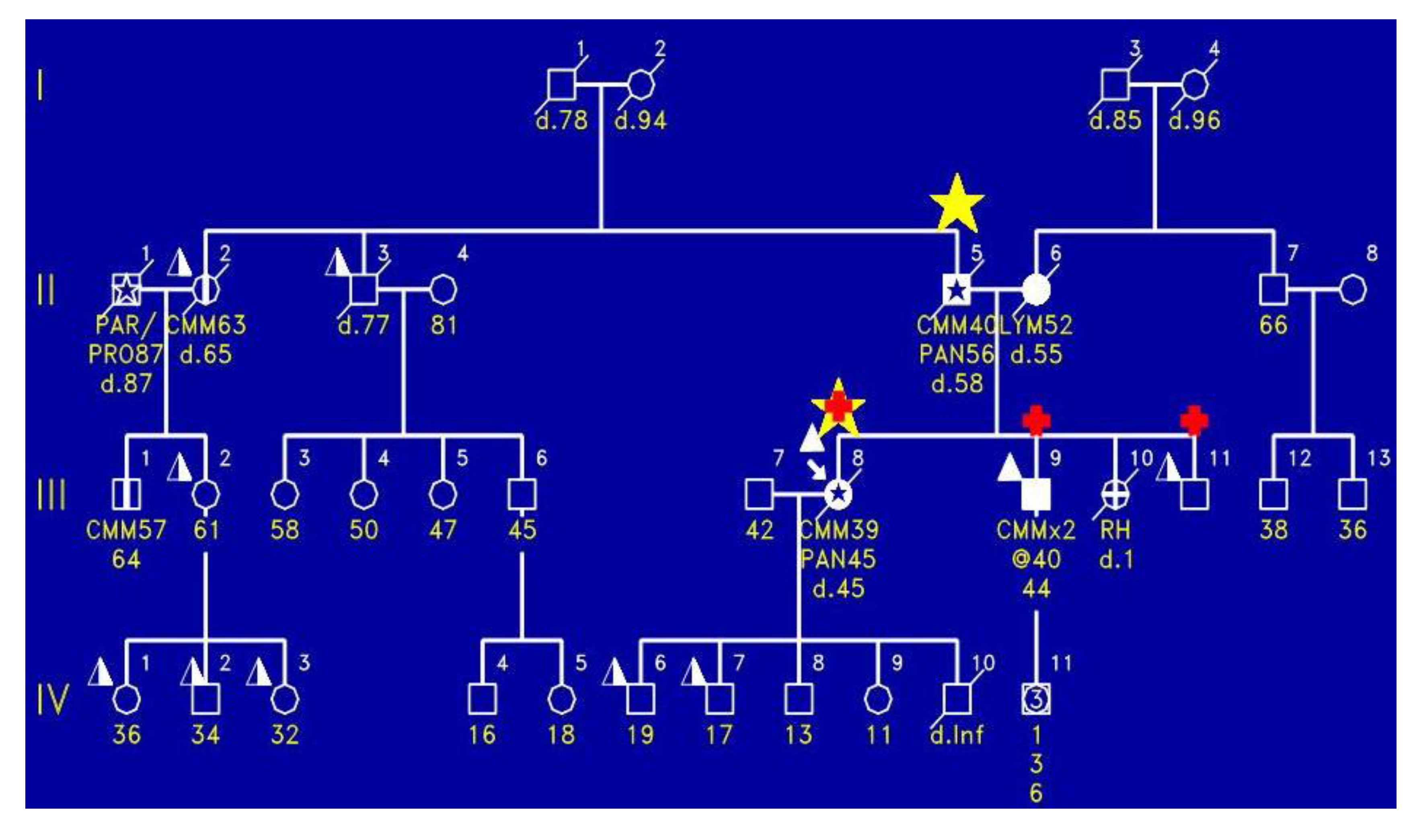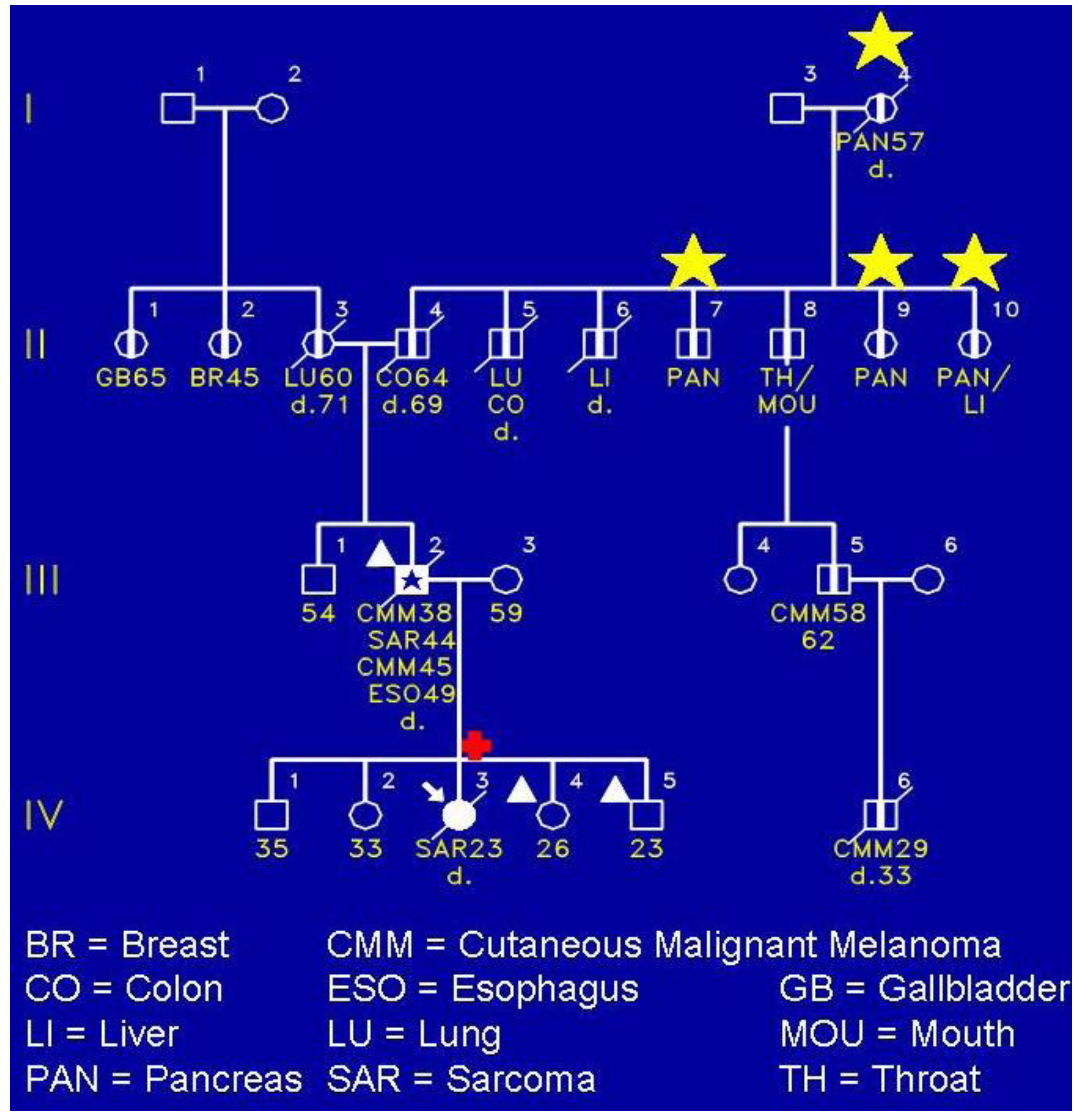Figure 3 shows a FAMMM family wherein the proband (IV-3) died of a sarcoma of her shoulder. She had the CDKN2A germline mutation. Of keen interest is that she did not have any evidence of the FAMMM phenotype comprised of multiple atypical nevi. However, her father (III-2) had the FAMMM phenotype, two melanomas, a sarcoma, and he died of esophageal cancer. He was a nonsmoker and not a consumer of alcohol. It is noteworthy that the proband’s paternal lineage showed four cases of pancreatic cancer as evidenced in II-7, II-9, II-10, and the proband’s paternal great‑grandfather (I-4). The yellow stars indicate the presence of pancreatic cancer.