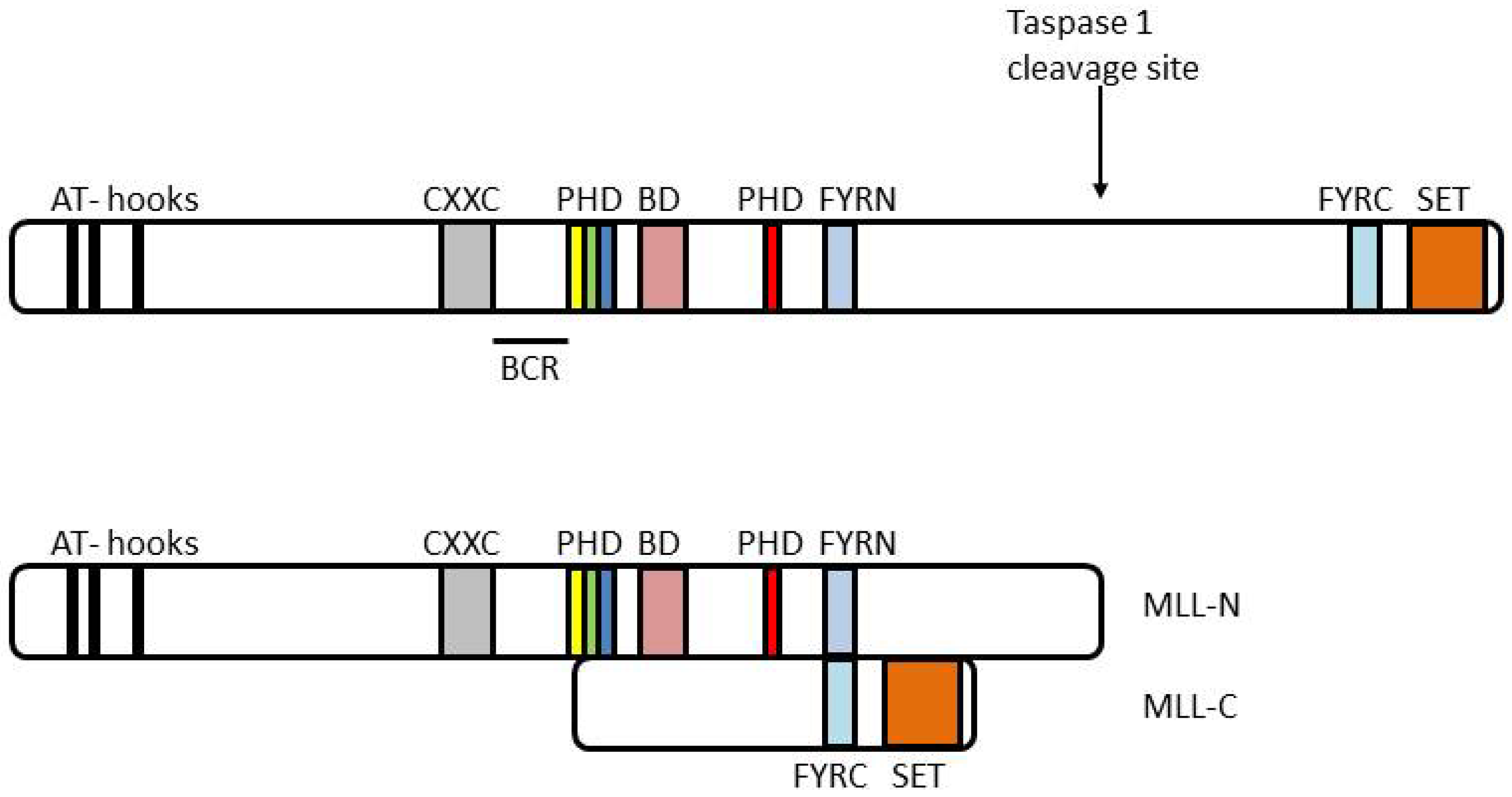 MLL protein structure. MLL has 3 HMG-like AT hooks (black bars) that bind AT rich DNA, a CXXC domain (grey bar) that binds unmethylated CpG DNA, four PHD (Plant Homeo Domain) fingers (yellow, green blue and red bars) that mediate interactions with several proteins; an atypical bromodomain (purple bar), FYRN and FYRC domains (light blue bars) and a C terminal SET domain (orange bar) that methylates histone H3 on lysine 4. Wild type MLL is cleaved by taspase 1 into two fragments: MLL-N and MLL-C. These fragments dimerize to form a stable complex. BCR = breakpoint common region. Adapted from [69].