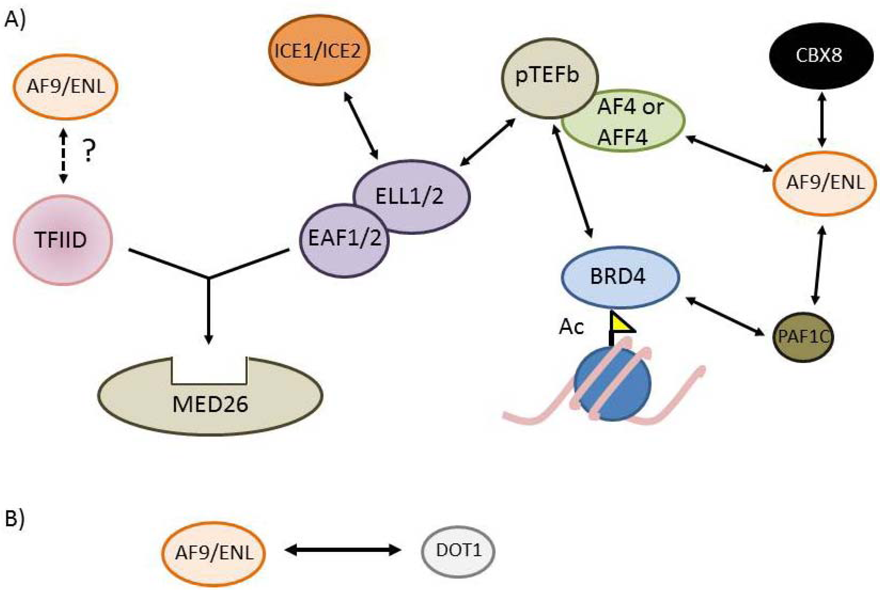 | MLLT1 | ENL, LTG19, YEATS1 | 19p13.3 | DOT1L, AF4, AFF4, CBX8, PAF1, CYCT1? |