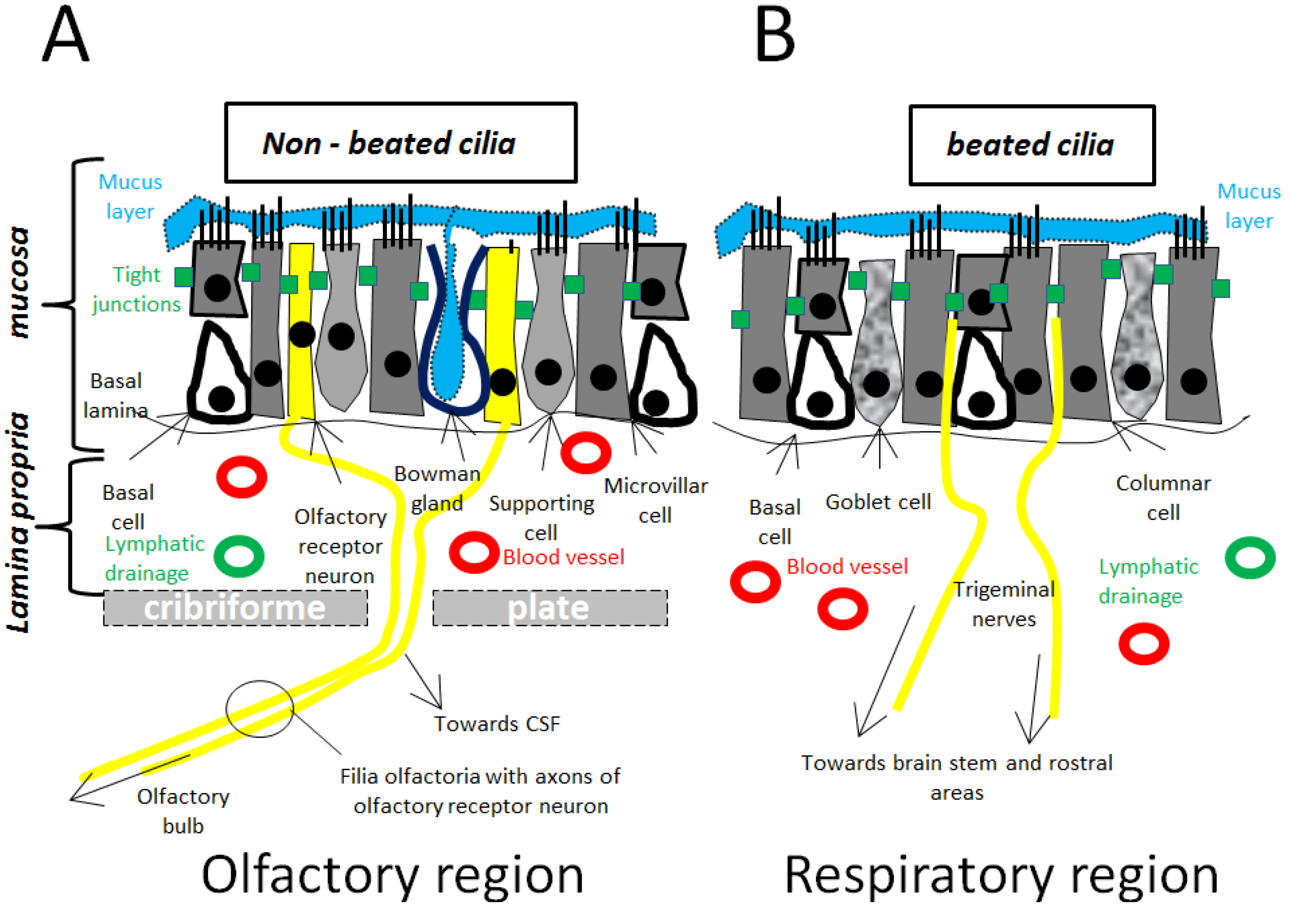 The exact mechanisms underlying nose-to-brain transport are not yet fully understood, but the olfactory pathway seems to play a pronounced role. The olfactory region in humans accounts for <10% of the nasal cavity. Pharmaceutical agents can gain fast access to the CNS along the olfactory nerve fibers of the olfactory bulb, which is the only anatomical structure of the CNS that is in direct physical contact with the environment. This was well-illustrated by Jansson et al. by intranasal administration of a fluorescent dye and subsequently monitoring of the route of transport along the olfactory nerves [28]. The olfactory pathway starts at the olfactory receptor neurons, located at the olfactory mucosa. These cells pick up olfactants and transmit the information to the CNS, mediating the sense of smell [29]. The olfactory receptor neurons are surrounded by basal cells, microvillar cells, and supporting cells, all connected by TJs. These basal cells act as neural progenitors cells which can replace the olfactory receptor neurons during their continuous turn-over. The constant replacement of olfactory receptor neurons, make the olfactory mucosa “leaky” and thereby improving the nose-to-brain transport [30]. From these olfactory receptor neurons, axons project through the cribriform plate which separates the nasal and cranial cavities, on to mitral cells in the olfactory bulbs. Subsequently the olfactory bulbs will project on to different brain regions including the olfactory tract, the anterior olfactory nucleus, the piriform cortex, the entorhinal cortex, the amygdala, and the hypothalamus [31,32]. Upon intranasal administration, intra- and perineural transport is possible along these projections.