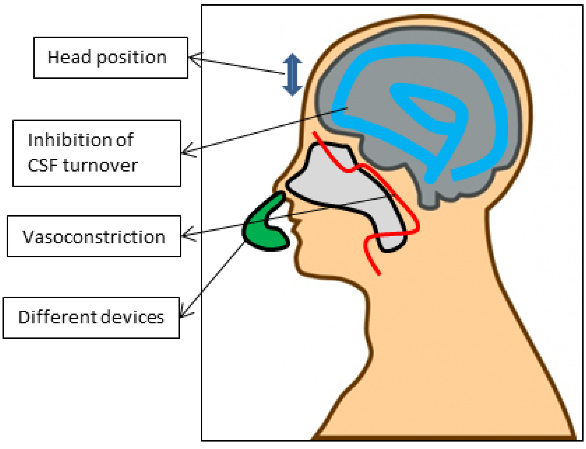 As the brain is well-protected by the blood-brain barrier (BBB), administering pharmacological agents with intracerebral biological activity is a challenging task [11]. Even when drugs are permeable through the BBB, it is often difficult to reach therapeutic intratumoral concentrations. To overcome this problem, local administrations can be used, such as convection enhanced delivery (CED), intracerebral infusion, and wafers at the resection site. CED is a continuous infusion that uses a convective flow to drive the pharmacological agent into a large tissue area. One or more catheters are placed in the tumor mass, around the tumor or the resection cavity. Even with the use of well-developed catheters as reflux-preventing, hollow-fiber and balloon-tipped catheters, the leakage of infusates is nearly always detected [12]. This leakage is a waste of therapeutic agent, and can, moreover, exert possible adverse effects on the healthy surrounding tissue and complicates the ability to estimate reliable iso-distribution volumes. Also, for CED, encouraging clinical data have been obtained, for example in the field of cytotoxin administration via CED [13]. Cytotoxins are recombinantly made proteins that consist of a vector/ligand/receptor and a bacterial toxin. A first example was DT.CRM107-Tf, a conjugate between transferrin and a diphtheria toxin derivative. Several clinical responses were observed but in phase III, toxicity was observed and the trial was stopped [14]. CED administration of IL13-PE38QQR, a cytotoxin that consists of IL-13 and Pseudomonas exotoxin A, was evaluated in a randomized phase III trial with recurrent GBM patients. It showed a median overall survival of 42.7 weeks and even up to 55.6 weeks for patients with an optimally positioned catheter [15]. The local administration of chemotherapeutic drugs via CED, for example taxol, has also been explored in brain tumor patients and seems to have modest beneficial effects [16]. We refer to an excellent review by Debinski et al. for additional information on the topic of CED in the context of brain tumors [17]. Despite these positive clinical outcomes, complications are unfortunately inherent to CED. Surgical installation of one or more catheters, and the convective inward flow, often lead to complications such as infection, wound healing problems, inflammation, edema, and seizures [18,19]. In particular, CED is unlikely to be practical for drugs which need to be administered chronically. In more recent years, the intranasal pathway has being discovered as a non-invasive alternative to the invasive CED treatment modality.