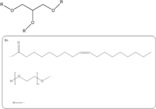 | Mixture of mono-, di-, and triglycerides and mono- and di- fatty esters of PEG (LabrafilTM) | ![]() | Emulsion |