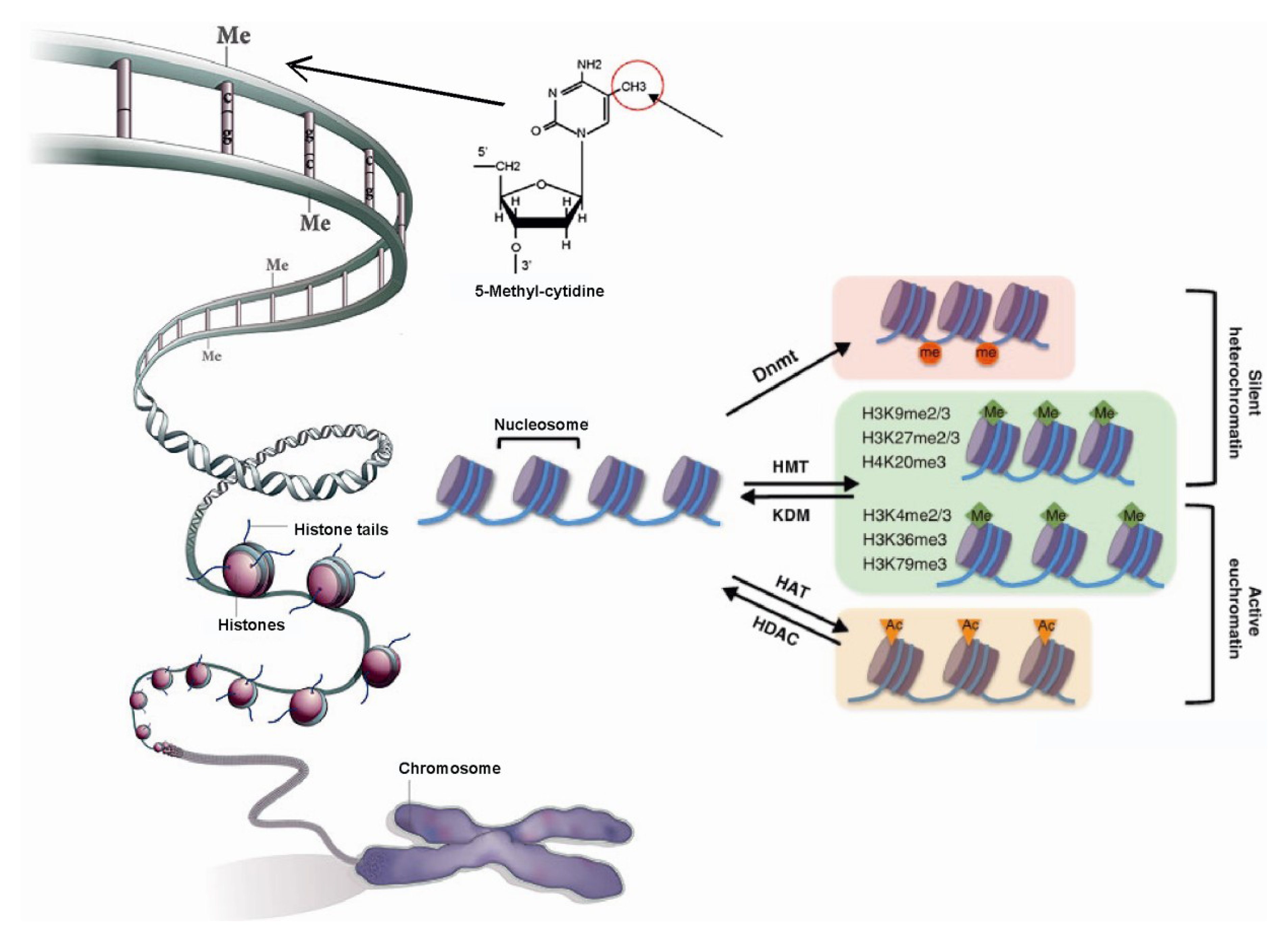 The extent of chromatin condensation at each locus plays an important role in regulating the access of nuclear proteins to their target sites in DNA and hence directly influences cell functions [1]. The state of chromatin at a particular gene was found to be crucial for cell-fate decision making processes and has been implicated in both normal cell differentiation and oncogenic transformation. Remodeling of chromatin can be achieved in several, interconnected ways, including covalent modifications of histones and DNA methylation. Covalent modifications in DNA and chromatin structure constitute an “epigenetic code” [2] which is superimposed upon the genetic information contained within DNA and serves to regulate gene activity both during development and in a number of pathological situations, including cancer.