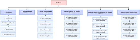 As shown in Figure 1, we have organized this survey hierarchically. Starting, in Section 1, by a complete overview of the NDN architecture: the essential components, the forwarding strategies, the naming schemes, content caching strategies, and we end up with a complete cover of the pre-existed security mechanisms in NDN. In Section 2, we did walk through most of the security threats for the NDN architecture, and we classified them in-depth by the security target component such as availability, confidentiality, and integrity. Then, we proceed to further studies of the process and the impact of each attack. In Section 3, we detail recent detection and mitigation mechanisms of each attack presented in Section 2; we classified state-of-the-art NDN IDS into four well-organized categories of the solutions studied in each category. A deep analysis of the challenges and limits of each NDN IDS is presented in Section 4. Finally, in Section 5, we elaborated on the open research issues related to NDN security.