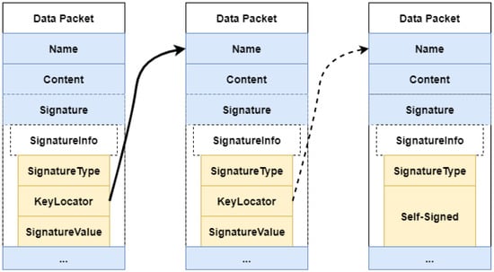 Security in NDN is insured since the foundation of this architecture and each packet is transmitted while guaranteeing several security goals such as confidentiality and data integrity. In NDN, a Signature field is inserted in each Data packet and the content and the signature are binded together, to insure the verification of the data along the way of its transmission. When a data packet is received, the requesting consumer verifies the signature field. Although, the verification by intervening routers is not mandatory because the verification overhead of the signature might be high, and a router needs access to multiple public key certificates to trust the public key that verifies a content signature [,]. More precisely, the signature field of a data packet is composed of two sub-fields, namely SignatureValue and SignatureInfo, that are used to monitor authenticity and integrity. Any node that receives a data packet can utilize the information in the SignatureInfo to obtain the publisher’s public key. This public key will then be used to decrypt the SignatureValue. After that, the result is compared to the hash of all other data fields. This procedure allows the consumer to check the data packet’s integrity. Furthermore, in order to authenticate the content provider’s legitimacy, the user must have credibility in the owner of the public key used to sign the data. The hierarchical name structure helps in the formation of trusting associations. For example, if we take a piece of content with the prefix /www/rnu/fsg/com/tn/index.html, the signature then is made up by the owner of /www/rnu/fsg/com/tn domain, in which the key, is certified by the owner of /www/rnu/ domain as a result; it forms the chain of trust, which is linked by the KeyLocator [], as shown in Figure 3. The available signature types pre-defined in NDN are: