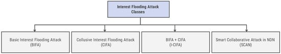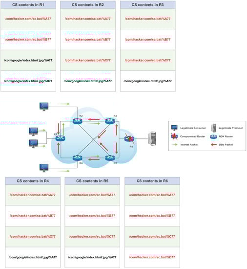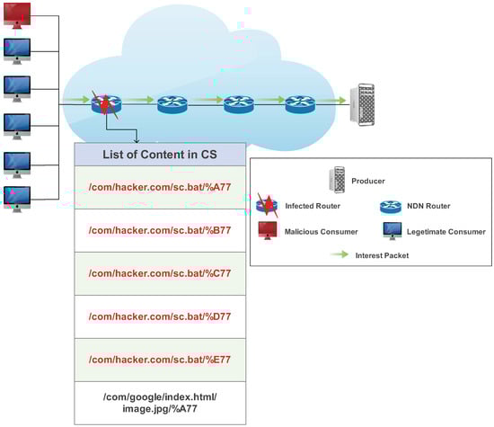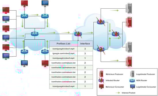 As shown in Figure 5, an Interest Flooding Attack is a type of attack that targets the Pending Interest Table (PIT), and aims to send a huge amount of interests into the desired router, which forces all these routers to create entries in their PIT that remain open during the attack. As a result, the PIT entries will no longer be available for legitimate consumers and keep dropping each packet sent by them [,].