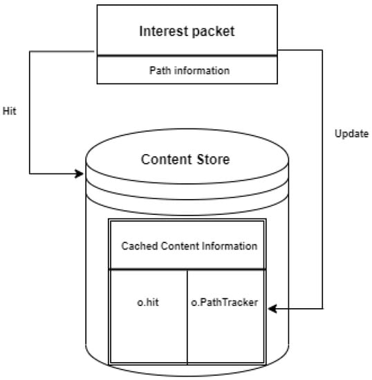 As shown in Figure 2, a consumer requests data by sending an interest packet to the router. The router looks for such content in the Content Store (CS) if a cached copy exists; it sends it back to the consumer using the same interface through which the interest packet is received. If the content is not present in the CS, then the router checks the PIT entries, if an entry matches the interest prefix (the name of the requested content), the Interest’s incoming interface is added to this entry and the received Interest will not be forwarded, and it is going to be dropped [,]. If no entry has been found in the PIT, a new entry will be created, and the received Interest is forwarded based on the routing information of the FIB. Although, if no matching route is found in the FIB, a Negative ACKnowledgments (NACK) [] with “No route” alert raises, the Interest will be dropped or becomes broadcast, based on the routing policy of the router [].