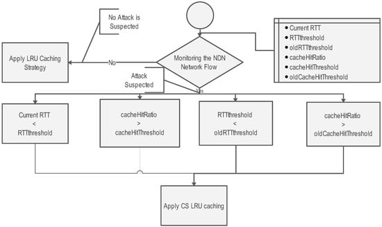 This attack is difficult to detect because it is hard to identify the attacker in the NDN architecture (NDN conserves the privacy of the consumers). In addition, the attacker does not follow a specific pattern, such as the amount of interests sent per second and the hierarchy of prefix naming. Moreover, the time of launching the attack is not stable and, in several cases, follows different strike timing. Deng et al. [] classified CPA into two main categories: Locality Disruption Attack (LDA) and False Locality Attack (FLA). For LDA, the malicious consumer requests masses of junk content. This type of content gets cached in the CS and this malicious consumer keeps requesting it to keep it in the CS. In the case of FLA, the malicious node requests already existing content with less popularity in order to prevent other legitimate content from getting higher popularity and falsify the priority rules implemented in the caching policies, which forces it to be useless.