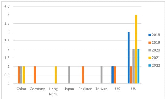 The exploration of augmented and virtual reality (AR/VR) interventions in enterprise hazard identification demonstrated unique trends with regard to the share of contributions from the field. Notably, civil engineering and the construction industry demonstrated significant use of AR/VR technology, primarily for risk assessment exercises. This sector also showed considerable interest in applying VR/AR technology to enhance hazard identification and management. The Fire and Emergency department emerged as a major user of AR and VR, particularly for training employees to handle emergencies. Ranking third, the healthcare and medical sectors highlighted the potential of AR/VR for improving hazard assessment in medical settings. Additionally, these technologies have been applied in fields such as sports, driving simulations, agriculture, and fall prevention for older adults. As highlighted in this paper, AR/VR interventions have proven versatile enough to adapt to difference scenarios across various fields, changing approaches to hazard assessment while promoting safer, better-informed decisions. Figure 2 below shows the frequency of research submissions by year and geographic location.