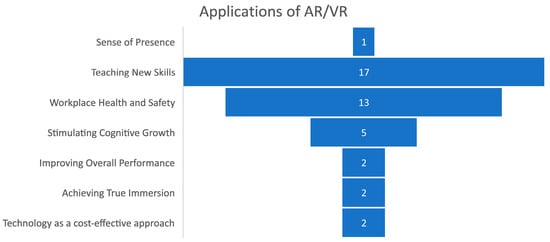 The analysis of the twenty-two reviewed studies exposed important features of the various ways in which AR and VR are employed. These articles contribute to increasing the knowledge database in the field, and the work they do can be grouped into several topics. Out of 17 papers, augmented reality and virtual reality have benefited authors in acquiring new content knowledge [,,,] as shown in Figure 3, explaining why they have been used as instructional tools. These technologies have been pointed out as crucial by 13 publications for Workplace Health and Safety [,]. Moreover, 5 papers have explored the cognitive development [,,] that the AR/VR can provide. Two papers were aimed at increasing general effectiveness [,], assessing immersion aspects [,] of AR/VR and comparing costs with non-technological solutions [,,].