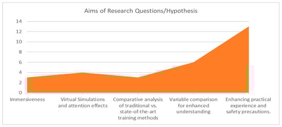 The use of Augmented Reality (AR) and Virtual Reality (VR) in hazard recognition and prevention comprises a rich tapestry of research aims, as seen by our extensive evaluation of 22 selected papers. Three publications theorized and focused their research on increasing the experience of immersion in AR/VR settings [,,] highlighting the importance of immersion. Four publications have focused on the immersive characteristics of virtual simulations and their possible impact on attention [,,,] laying the way for lively debate. Furthermore, three publications attempted to give useful comparative assessments, pitting traditional training techniques against cutting-edge AR/VR training methodologies [,,] so providing crucial insights into these technologies’ revolutionary potential. A notable subgroup of six publications conducted variable comparisons, adding to our understanding of the intricacies of AR/VR adoption [,,,,,]. Issue with technology adoption is an umbrella term used in AR/VR that refers to in-adequate headmounted display sizes, feelings of fatigue due to excessive use, motion-sickness and safety issues. Discussion of these terms are beyond the scope of this article. However, AR/VR genuinely shines in the arena of practical experience and safety measures [,,,,,,,,,,,,], with a sizable 13 papers making major contributions in this sector as depicted in Figure 4. These findings highlight the diverse nature of AR/VR research and the critical role it plays across a wide range of applications and goals.