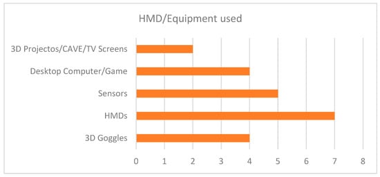 AR and VR in the hazard identification and risk mitigation field, specifically while using the tools and technologies emphasizes their function as critical factors for determining the results. The following is the list of the HMD/equipment used in the reviewed articles as shown in the Figure 5 below. Out of the 22 articles reviewed, seven articles adopted HMD, including OnePlus, HTC Vive, and Oculus Quest/Rift, and other immersive tools [,,,,,,]. All these devices acting as a window to the AR/VR worlds enable deep interactions. Overall, five research papers have focused on the issue of integrating more sensors, which only makes the sense of presence and performance even better while at the same time supplying new skills. These sensors include gyroscopes, Garmin Vivo smart devices, wristbands, accelerometers, and emotive sensors [,,,,]. Four articles have focused on the use of 3D Goggles, including Tobii as a brand [,,,].