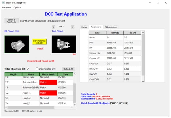 Our approach was tested in the following way: We took every object from the database (considered as our DCO), then randomly rotated, translated, and re-meshed them, and then performed a database search using our two-layer approach. The first layer checked the correspondence of features of two objects; if the objects are scaled versions of each other, they will be considered as non-matching (as they have, for example, different volumes). In case we needed to identify the scaled objects as matching, then before the analysis, we additionally needed to scale the objects to the same standard size.