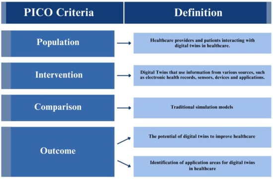 The objective of this research was to analyse scientific publications with the purpose of investigating the use of digital twins in healthcare and the trends and challenges in their use, providing insight into the possible paths of healthcare. This research sought to answer two guiding questions: “How are digital twins being used in the healthcare sector?” and “What are the challenges and perspectives of using digital twins in the healthcare sector?” The PICO strategy (acronym for P: population/patients; I: intervention; C: control; O: outcome) is used to help to define what the research question should in fact specify for this paper. Figure 1 presents the four components of the PICO strategy.