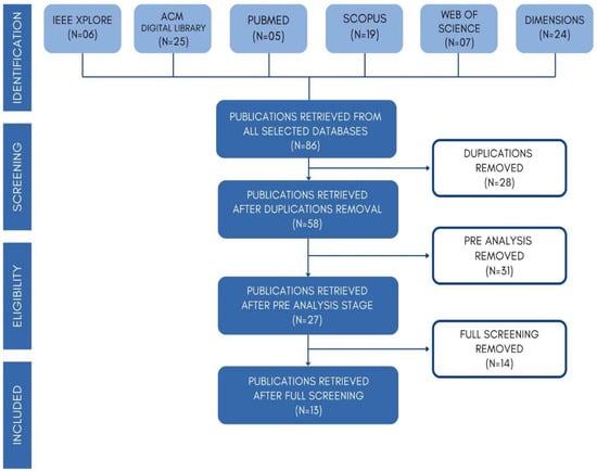 The Preferred Reporting Items for Systematic reviews and Meta-Analyses (PRISMA) was a great help for authors to prepare transparent accounts of their reviews, providing syntheses of the state of knowledge in a field, from which future research priorities can be identified. For this paper, a literature search was conducted in digital libraries of six academic databases: IEEE Xplore, Dimensions, Scopus, Web of Science, PubMed, and ACM. The six databases were chosen with the aim of covering the Engineering and Health research areas. IEEE Xplore and ACM serve the purpose of containing the Engineering/Technology area, whereas the PubMed database is focused on the health area. Scopus, Web of Science and Dimensions incorporate many fields of knowledge and were included to identify any other records relevant to this study that were not in the specific databases. We tried to restrict the search by using specific keywords to find publications of interest.