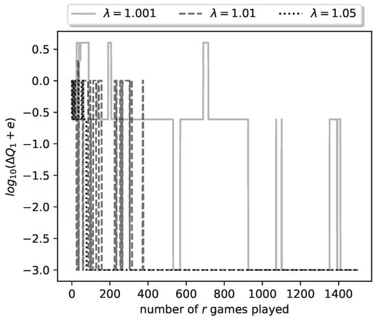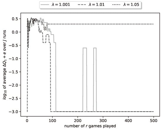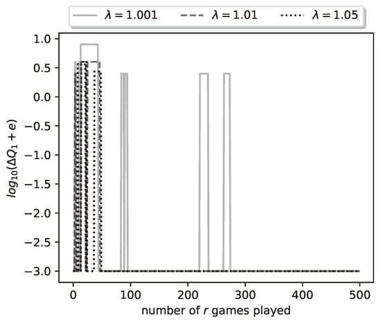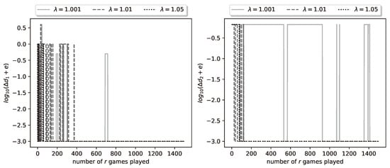 Let us look again at the final results of a representative run of the learning algorithm. With , , , , and , we run the learning algorithm with , , and for the values . In Figure 8 we plot the logarithm (with base 10) of the relative payoff error . We see similar results as in Group A, for all values, the algorithm achieves zero relative error. Convergence is achieved by the 300th iteration of the algorithm and it is fastest for , and slowest for . The plots of the errors , are omitted, since they are similar to the ones given in Figure 5.