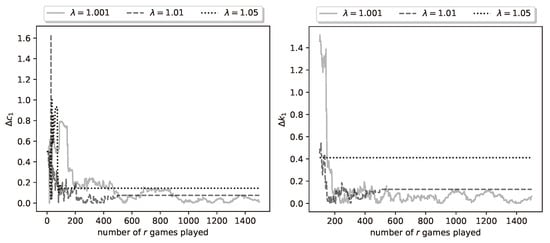 The above observations corroborate the remarks at the end of Section 4 regarding reinforcement learning. Namely, a small learning rate (in our case small ) results in higher probability of converging to the true parameter values, but also in slower convergence. This can be explained as follows: a small results in higher values for a large proportion of duels played by the algorithm; i.e., in more extensive exploration, which however results in slower exploitation (convergence).