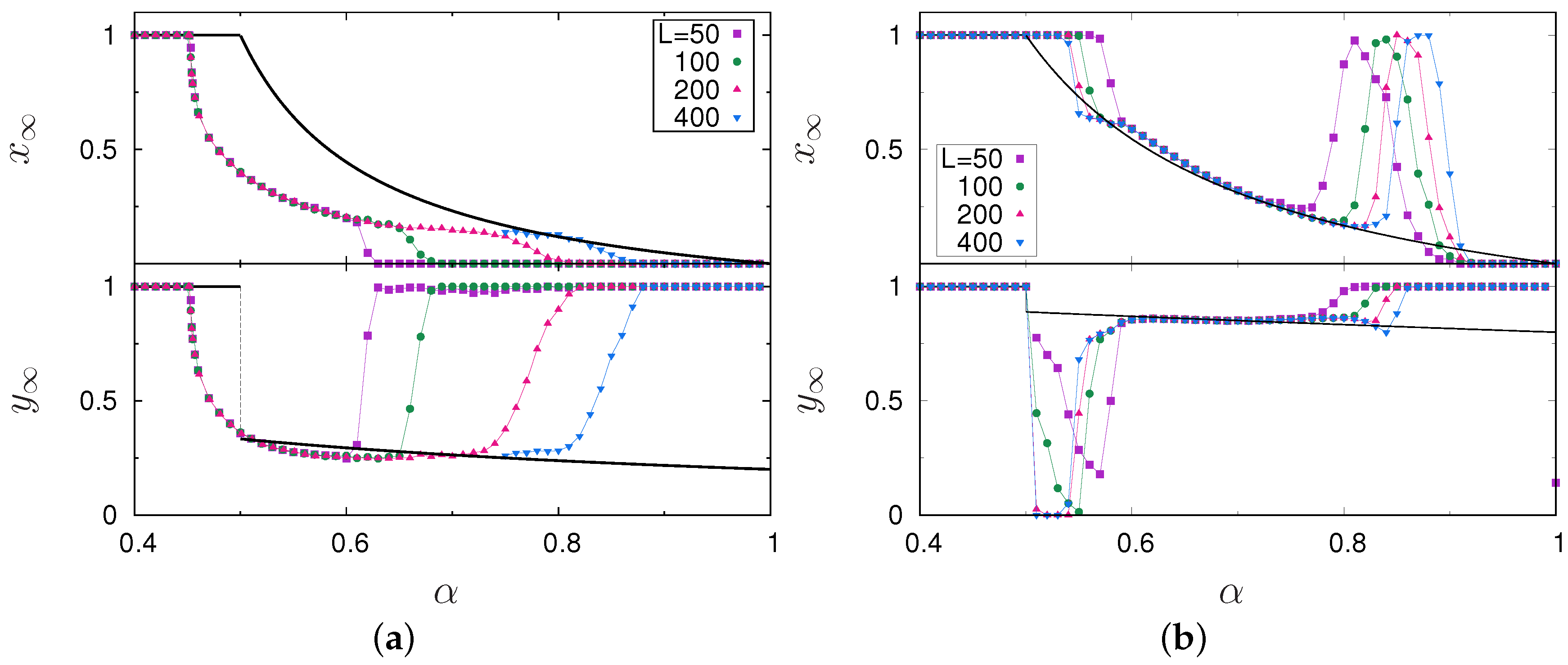 We here focus on the non-trivial behavior inside the coexistence phase where both preys and predators present mixed, collective and individual, strategies. Figure 1 shows the asymptotic values and as a function of α for and 0.6. The former was extensively discussed in Ref. [4], albeit with a slightly different dynamics, and is shown here for comparison purposes. The mean-field behavior (solid lines) barely changes for different values of β: and are monotonously decreasing functions of α, with a continuous or discontinuous transition, respectively, when passing from the (1,1) phase, at , into the coexistence phase. For , as β goes from 1/3 up to 2/3, tends to be flatter and closer to 1. On the other hand, simulations on the square lattice depend on the particular values . Quite noticeably, there are strong finite-size effects. For large values of α, both cases and 0.6 get absorbed by the (0,1) phase. The region where this happens, however, decreases with L and eventually disappears. These two cases differ in at least two remarkable features: The behavior close to the transition and the overshoot of toward 1 just before being absorbed by the 0 state. Notice also that the location and nature of the transitions change, differing from the mean-field predictions.