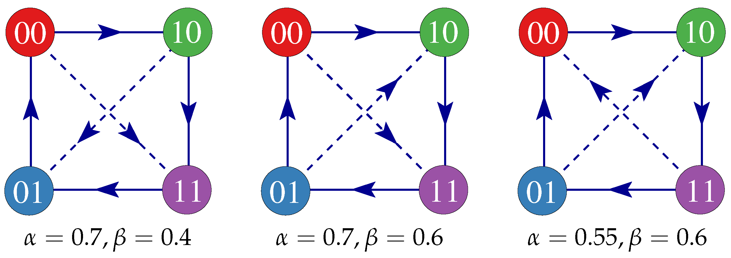 Examples of flux graphs showing the direction of invasions for some values of α and β, the difference being the orientation of the diagonals, 01-10 and 00-11, invasions. Notice that there are no neutral strategies, although the invasions along the diagonals are not direct and involve the creation of the intermediate strategies.