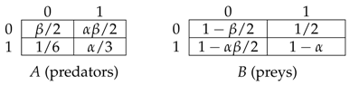 Payoff matrices for predators (A) and preys (B).
