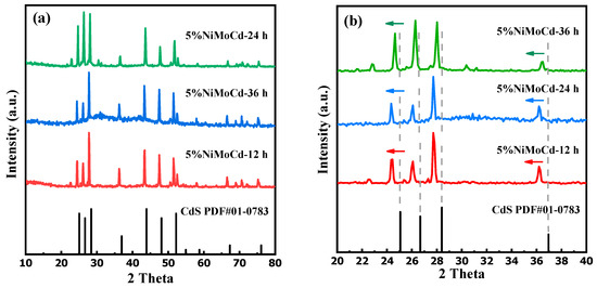The powder X-ray diffraction (XRD) patterns of x%(NiMo6)@CdS-τ (x = 5, 7.5, 10, τ = 12, 24, 36 h) composites are shown in Figure 1a–f, respectively. Although, after modification with variable amounts of NiMo6 precursor and variable hydrothermal time, all XRD patterns turned out to be similar and all peaks of pristine CdS could be obviously detected in Figure 1a,c,e, according to Jade card No.01-0783. It implies that the introduction of Ni and Mo shows little influence on the bulk CdS structure. Despite this, Ni, Mo co-doping increases the lattice constant of the CdS structure, resulting in a small peak shift towards a lower angle, as shown in Figure 1b,d,f. Nonetheless, the crystalline structure of Ni and Mo species was still uncertain from the above XRD patterns, and hereafter, identified by X-ray photoelectron spectrum (XPS) measurements that will be discussed later.