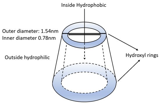 An illustration of the beta-cyclodextrin functionality and dimensions.