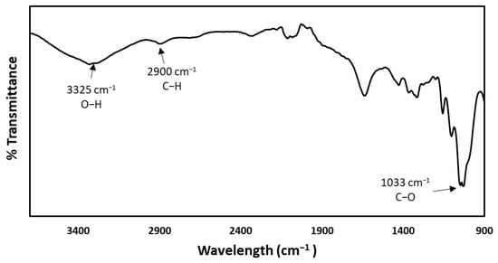 The FTIR spectra pattern of gold nanoparticles solution is shown in Figure 4. The O-H stretch at 3325 cm−1 indicates the presence of hydroxyl group of beta-cyclodextrin []. The peaks at 2900 cm−1 and 1033 cm−1 correspond to the CH group and C-O stretching [,]. These results confirmed the presence of beta-cyclodextrin within our samples.