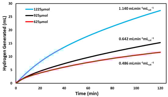Comparison of the volume of hydrogen gas generated versus time by the hydrolysis reaction of three different concentrations of sodium borohydride (625 µmoles, 925 µmoles, 1225 µmoles) as catalyzed by BCD−AuNPs. The reactions were run at 295 K and at pH 7 for roughly 120 min.