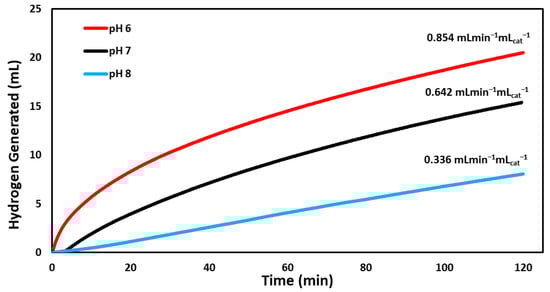 Volume of hydrogen gas generated versus time as catalyzed by the BCD−AuNPs under varied pH conditions (pH 6, 7, 8). The reactions were run at 295 K with 925 µmoles of NaBH4 for approximately 120 min.
