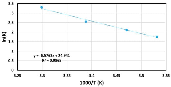 Arrhenius Plot used in association with Equation (2) to determine the activation energy of the NaBH4 reaction catalyzed by the BCD−AuNPs.